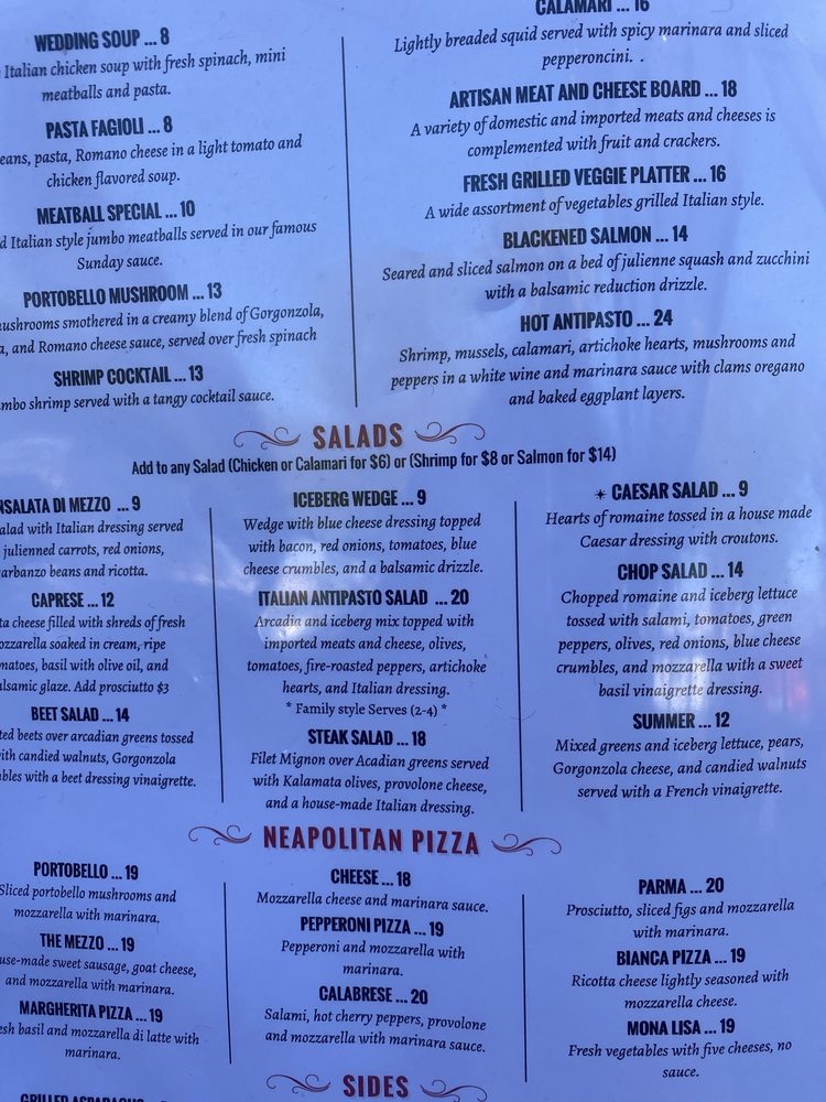 Arcadia and iceberg mix topped with imported meats and variety of cheese with olives, tomatoes, fire roasted peppers, artichoke hearts and Italian dressing.